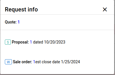 Для получения информации о конкретном запросе необходимио нажать на значёк вопроса возле имени клиента в появмвшемся окне отобразится информация о номере квотации в которую включён данный запрос, а также информация о номере предложения и номере заказа покупателя если они дбыли созданы, а также их статус (детально о статусах в разделе статусы запросов);